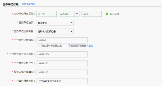 6.主办单位证件住所:证件住所需要与提供的主体证件上注明的地址完全一致
